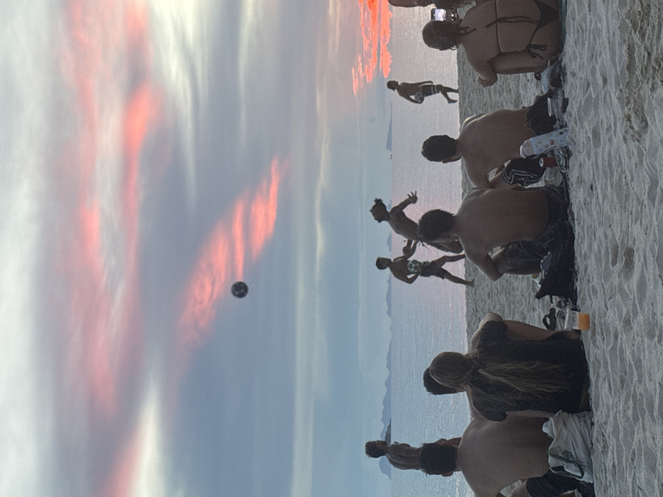 This image captures a sunset scene on a sandy beach in Baan Sri Thanu, Thailand. The sky is characterized by streaky pink and orange clouds, particularly prominent on the left and right, against a lighter blue-grey. A dark, spherical object, likely a ball, is visible high in the sky, off-center to the left. In the foreground, six individuals are seated on the sand with their backs to the viewer, facing the ocean. From left to right: one person is partially visible; a shirtless male with a white fabric bag to his left; a female with long, light brown hair in a ponytail, wearing a dark top, with an orange beverage in a clear plastic cup to her right; a shirtless male with dark items (possibly clothing or a bag) next to him; another shirtless male; and a female wearing dark bikini bottoms, holding a small object (possibly a mobile phone) in her left hand, which is slightly raised. In the midground, at the water's edge, several individuals are engaged in a beach sport. Four males are visible: one shirtless male stands on the far left; two shirtless males are central to the action, with one holding a light-colored ball and the other in a dynamic pose, head tilted back as if striking or reacting to a ball; a fourth shirtless male walks on the right, carrying a ball under his left arm. The background features calm ocean water and a series of dark, low-lying islands or landmasses silhouetted against the horizon.