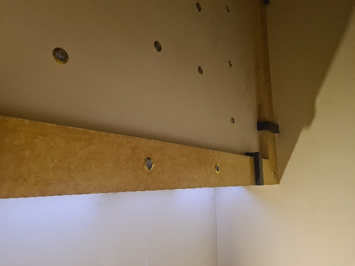 An interior architectural scene photographed in At-Tall, Syria, depicts a ceiling and upper wall. A prominent, light brown, diagonally textured panel extends from the upper left to the mid-right, embedding at least three circular recessed light fixtures. To the right of this panel, a lighter, flat ceiling surface contains at least six additional circular recessed light fixtures, some illuminated. Below the diagonal panel, a horizontal light brown beam is visible, secured by at least two dark, L-shaped support brackets. A light-colored, possibly beige, wall occupies the lower left and bottom sections of the frame, meeting the ceiling structure. Artificial light sources from the recessed fixtures cast distinct shadows on the lower ceiling elements and the wall.