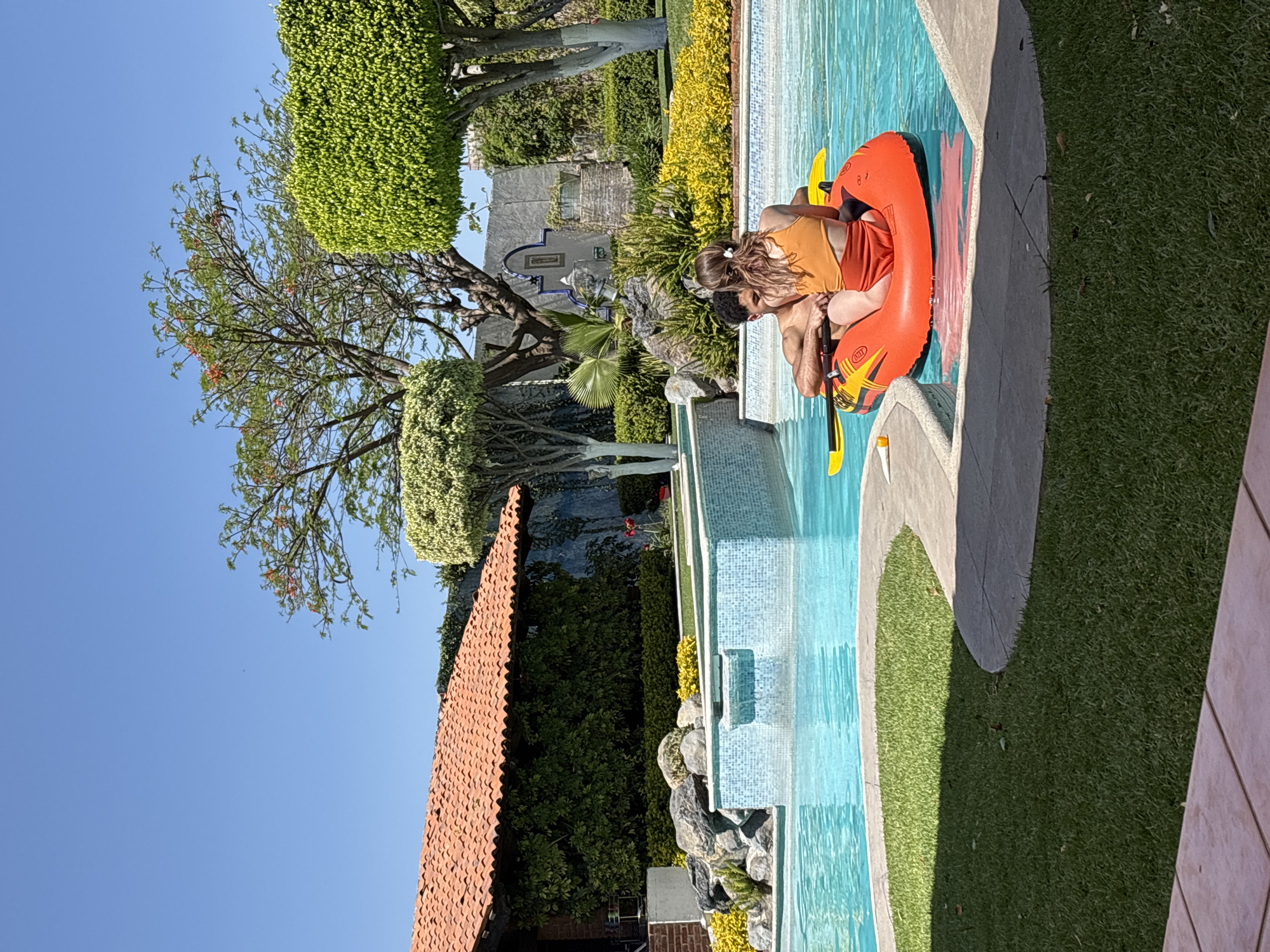 A daytime shot features a man and a woman sitting in an orange inflatable raft in a swimming pool. The pool is surrounded by a stone coping, with grass and paving extending outwards. A building with a terracotta tile roof is seen in the background along with manicured hedges and trees. The location appears to be in Puebla, Mexico, given the architectural style of the building.
