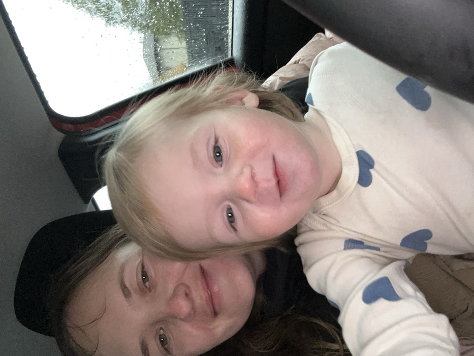 The image depicts an adult female and a young child within a vehicle, identified as being in the city of Como, Italy, during rainy, overcast conditions. The adult, with dark hair and wearing a dark top and cap, is partially visible on the left side of the frame, looking at the camera with a subtle smile. The child, a blonde-haired, blue-eyed toddler, occupies the central and right foreground, also smiling directly at the camera. The child wears a light-colored long-sleeved shirt with blue heart patterns and exhibits faint red marks on the right cheek and above the right eye. The vehicle's interior includes visible red trim on the right side. The windowpane shows raindrops, and the blurred exterior background reveals a building, foliage, and a fence under an overcast sky.