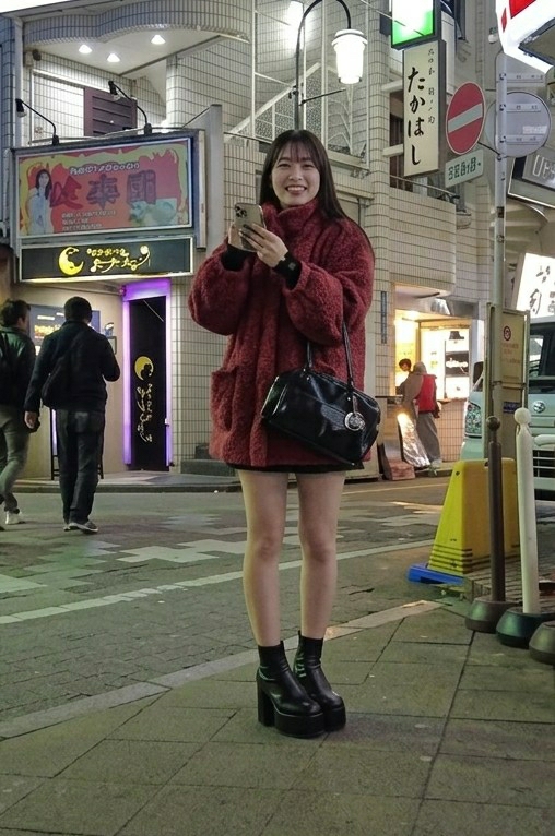 This nighttime image depicts an urban street scene in Gifu, Japan, specifically within the Miyasajimacho district, characterized by dense commercial buildings and entertainment venues. In the foreground, a young East Asian woman stands centered on a paved sidewalk, smiling directly at the camera. She has long, dark hair with bangs and is wearing an oversized, textured dark red turtleneck sweater-coat, a black mini-skirt, and black platform boots with chunky heels. She holds a light-colored smartphone with a clear case in both hands at chest level. A black patent leather shoulder bag with a circular silver embellishment hangs from her left shoulder. Behind her, on the left side of the frame, two men walk away from the camera. The man closer to the foreground wears a black jacket and jeans. Further back, another person in a reddish top is partially visible inside a brightly lit storefront on the right. The background consists of multi-story buildings adorned with numerous illuminated signs. Prominently on the left, a large rectangular sign with a red background and gold border displays Japanese text ("必卓團"), an image of a woman, and a white animal. Beneath it, a black horizontal sign features a yellow crescent moon logo and Japanese text ("ななちゃん"). The entrance below this sign is illuminated with purple light. To the right of the main subject, a vertical white sign with Japanese text ("たかはし") is visible, above which is a green rectangular sign. Below "たかはし," a smaller white sign shows "宮佐島町" (Miyasajimacho). Utility poles with overhead wires and streetlights illuminate the scene. On the right, a yellow traffic cone with a blue base stands on the sidewalk, and a portion of a white vehicle is visible. The street surface has visible road markings.