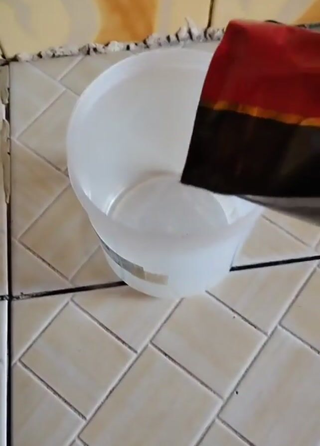 A person is pouring a bag of coffee grounds into a white plastic bucket. The bucket sits on a tiled surface. The bag has a red and black design.