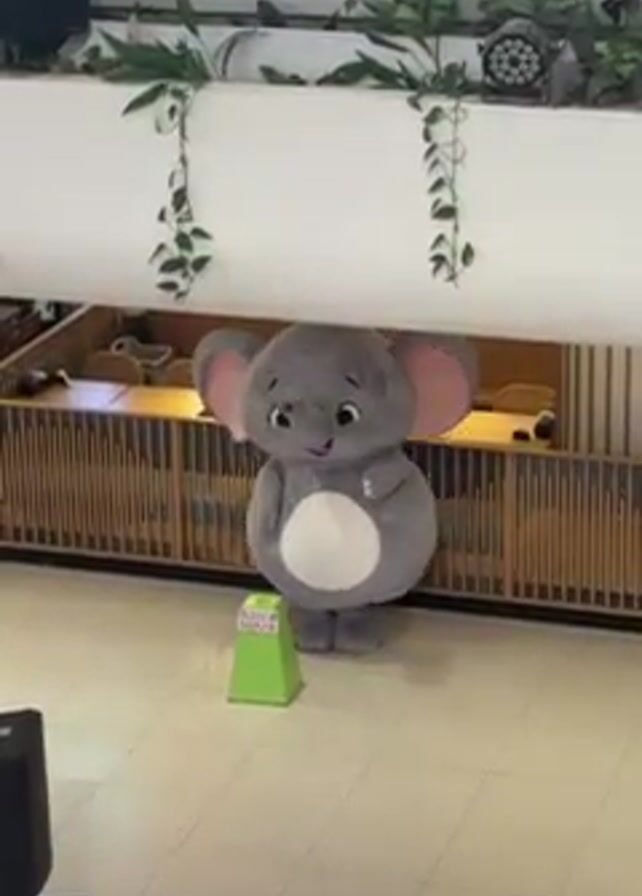 person in an elephant mascot costume standing in a large room with a green pyramid-shaped object in front of it. The mascot is gray and white with pink ears and a smiling face. The room has a tiled floor and a wooden barrier behind the mascot. There is also some greenery and a speaker visible in the background. A person walks into the frame from the front towards the mascot.
