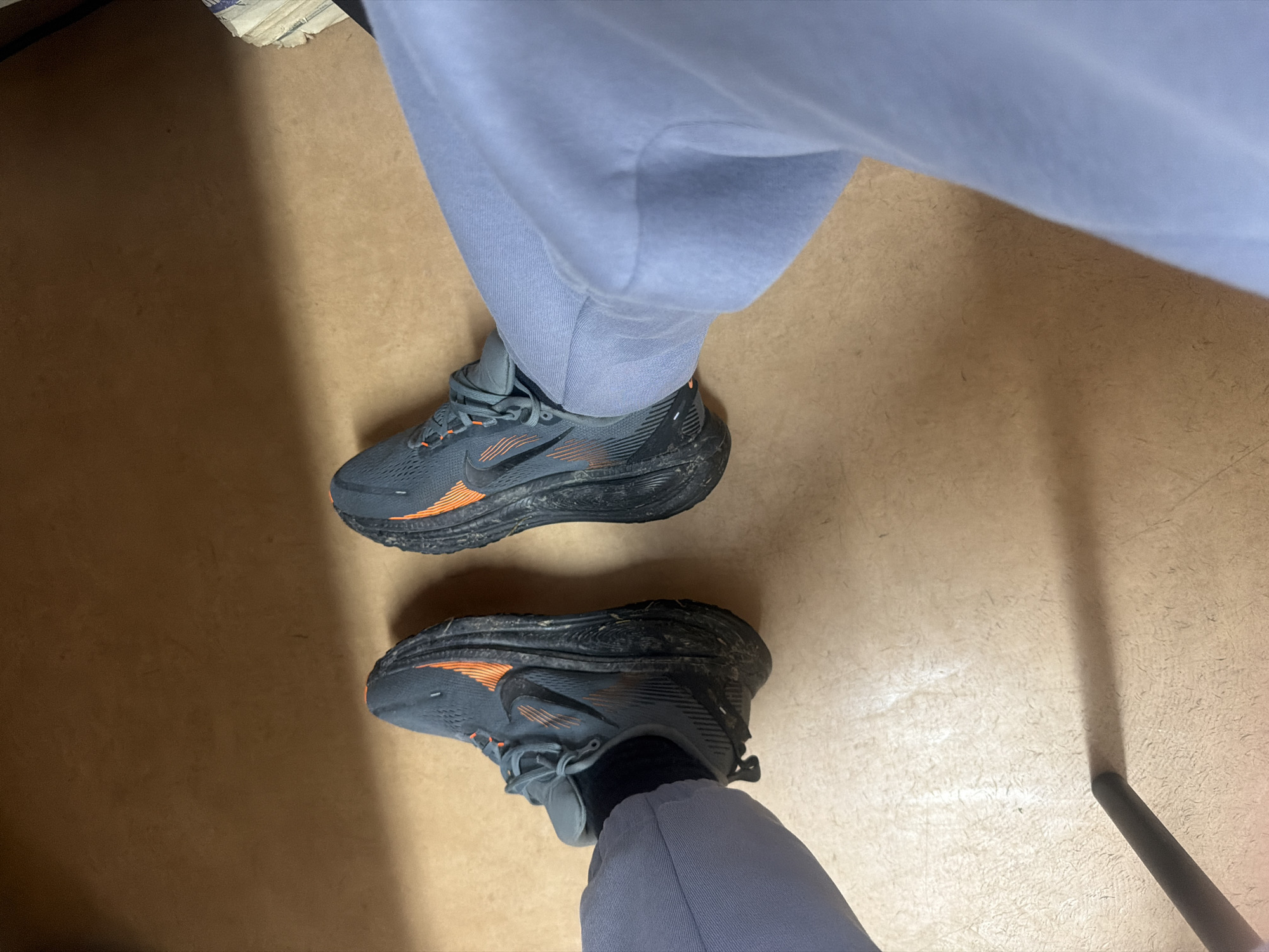 A high-angle photograph captures the lower extremities of a person seated or standing, looking down at their feet. The individual wears light blue sweatpants and two dark grey athletic shoes featuring orange stripe accents and laces. Both shoes are visibly caked with dried mud or dirt on their soles and lower sides. The feet are positioned on a light brown, textured floor. A black, cylindrical chair leg is partially visible in the lower-left foreground, casting a shadow on the floor. A stack of worn papers or books is partially visible in the upper-right background. The scene is located in Belozem, Bulgaria.