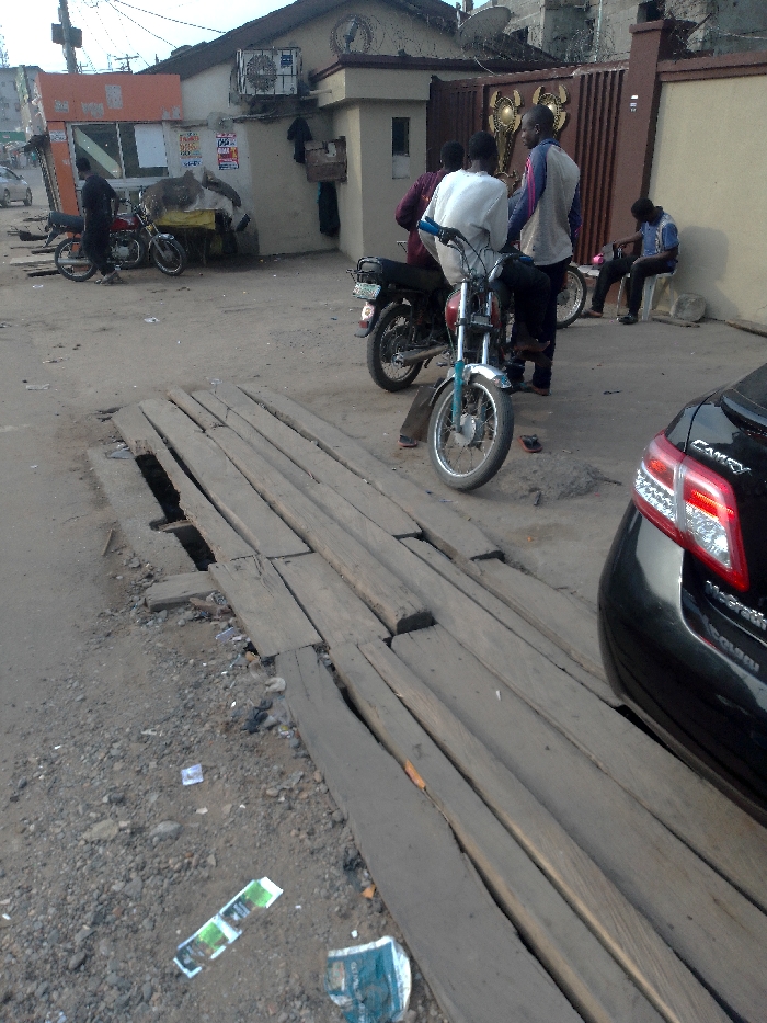 A damaged wooden bridge spans a ditch on a dirt road. Motorbikes, parked nearby, are occupied by several men. A black car is visible to the right. In the background, there is a commercial building with various posters and a residential building with an ornate metal gate. Litter and debris are scattered along the roadside, adding to the scene's disheveled appearance.