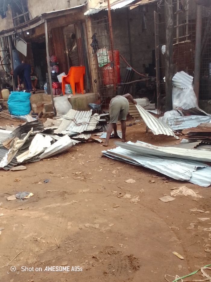 The image depicts an outdoor scene in Onitsha, Nigeria, showing a reddish-brown earth ground strewn with various debris, including scattered plastic and paper. Numerous corrugated metal sheets, some appearing new and shiny, others dull, bent, or rusted, lie across the foreground and midground. In the midground, a dark-skinned individual, viewed from the back, is bent forward, handling a piece of corrugated metal sheeting. This person is barefoot and wears light-colored shorts. To the left, closer to a building, another person in dark clothing is partially visible, also bent over, near a large, light blue sack or bundle on the ground. The background features a row of weathered buildings, possibly shops or stalls, with visible corrugated metal roofing and worn facades. One structure on the left has a raised concrete entrance step where a bright orange plastic chair is positioned. The interior of this shop displays stacked textiles or goods. To the right, a tall, red metal drum with white lettering is situated vertically behind a metal grate, with additional metal materials leaning nearby. Multiple figures are indistinctly visible within the shaded doorways of these structures. The scene suggests an active, semi-industrial or market environment.