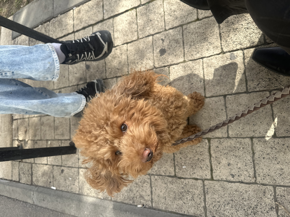 - "An outdoor scene in Tel Aviv-Yafo, Israel, depicts a small, reddish-brown, curly-haired dog seated on a light grey tiled sidewalk" by FM-oEXuH2, licensed under CC BY 4.0