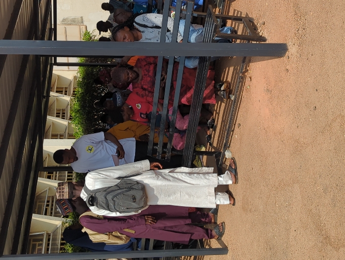 The image depicts an outdoor scene in Unguwar Rimi, Nigeria, set under a corrugated metal shade structure supported by dark vertical poles. The ground consists of reddish-brown earth with scattered small stones. In the background, a multi-story building with numerous rectangular windows is partially visible behind green foliage. Bright daylight is evident. Approximately twelve adults are present. Four individuals stand on the left side of the frame. From left to right: one individual is partially visible, wearing a dark head covering and a light-colored top; a male wears a dark maroon traditional garment and dark sandals; a male wears a white long-sleeved traditional garment, a patterned cap, and a gray backpack, facing away from the camera; and a male wears a light gray short-sleeved t-shirt with a yellow and black logo on the left chest, holding a white paper in his left hand, positioned near the individual in white. Eight individuals are seated on a dark metal bench with multiple slats, which extends across the middle ground. Notable seated individuals include a person in yellow attire (partially obscured), a woman in a red t-shirt, a woman with reddish-brown hair in a dark red patterned dress, and a woman in a light gray patterned top and blue jeans. Several seated individuals are looking down at mobile phones held in their hands. The attire observed is a mixture of traditional Nigerian garments and casual modern wear, with various individuals wearing sandals. The arrangement of people suggests a waiting area or public gathering point.