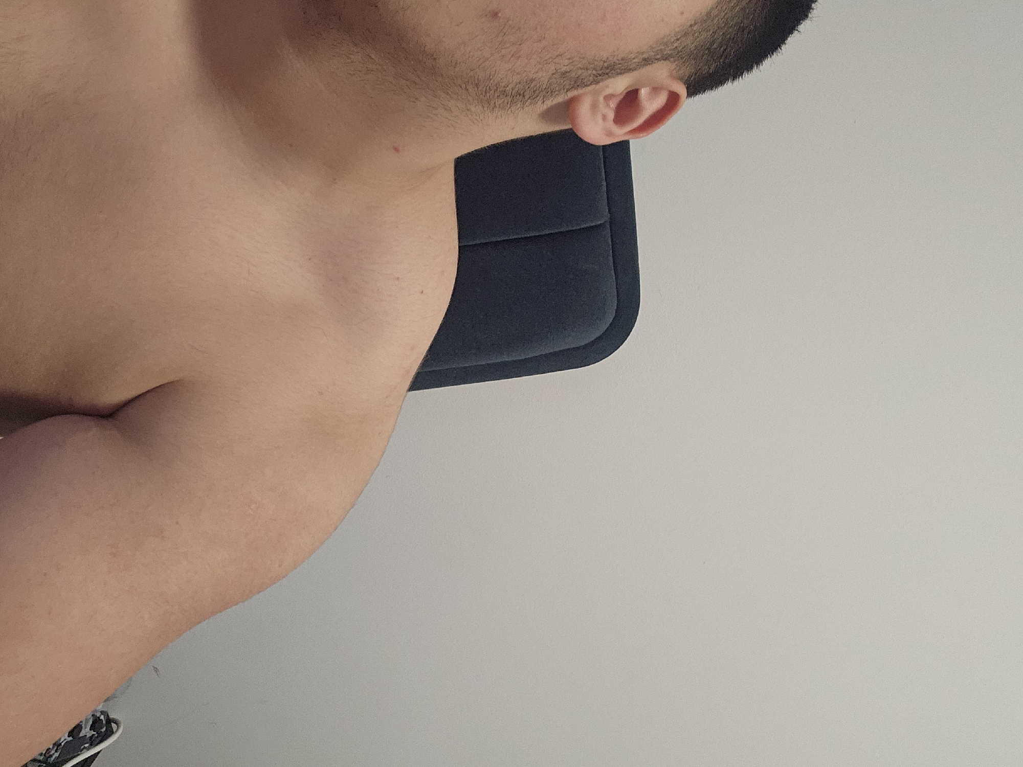 A close-up image depicts the left side of a male subject's upper body. His head, from the lower jawline upwards to include his left ear and a portion of his short-cropped hair, is visible. His left shoulder and upper arm are bare, exhibiting light-toned skin with minor follicular presence and several small red marks on the neck and shoulder area. The subject has stubble along his jawline. He is positioned in front of a dark blue upholstered chair back featuring two distinct vertical seams. The background consists of a plain, light-colored wall. In the lower right corner, an out-of-focus segment of patterned fabric and a white cable are discernible. The image provides no visual information to identify the specific city or location within Parvomay, Bulgaria.