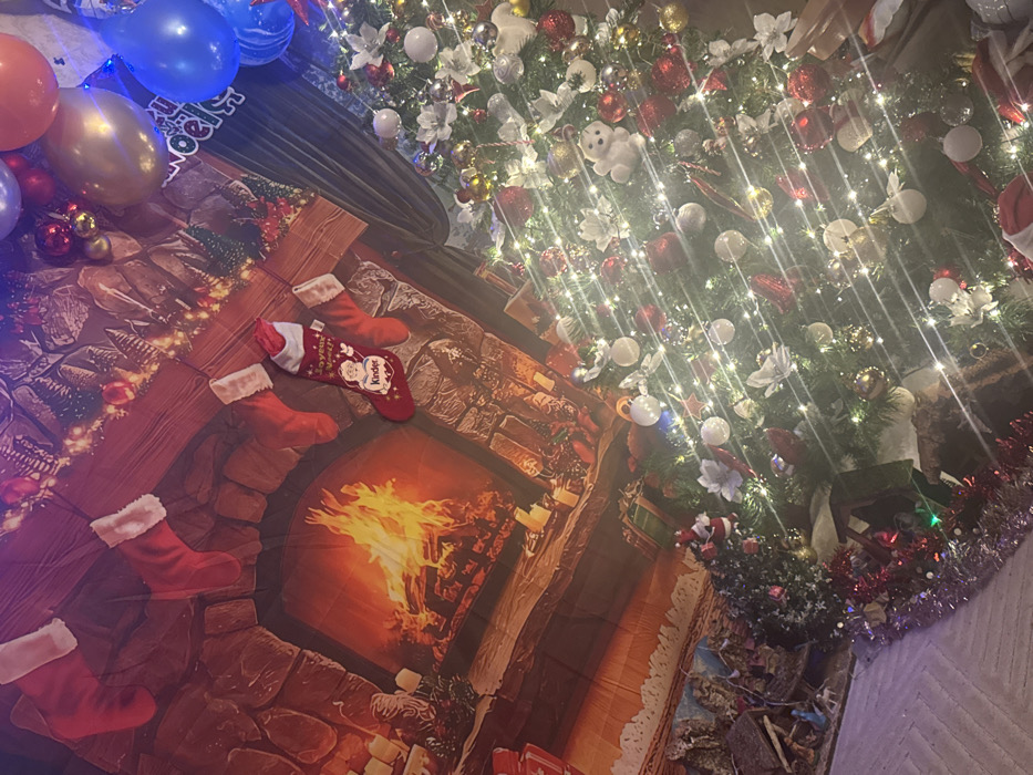 A decorated Christmas tree with lights and ornaments stands on a holiday-themed backdrop resembling a fireplace with stockings hanging above. To the left, balloons in various colors float near the edge of the backdrop, along with some Christmas ornaments. A Santa figurine can be seen near the base of the Christmas tree.