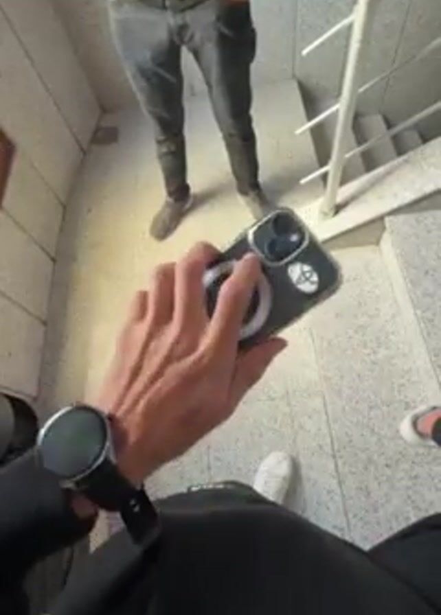 A person is holding an iPhone and taking a picture of another person smoking in a stairwell. The person being photographed is wearing a grey zip-up jacket, dark pants, and grey sneakers. They are standing on a landing in a stairwell with white walls and metal railings. The person holding the phone is wearing a black shirt and a smartwatch. There is another person in white sneakers standing nearby. The stairwell appears to be inside a building.
