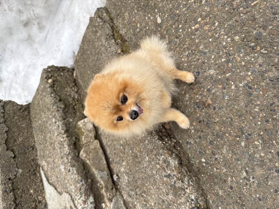 A Pomeranian dog, exhibiting orange and light brown fur, is observed sitting on a coarse concrete surface within the city of Chaikovsky, Russia