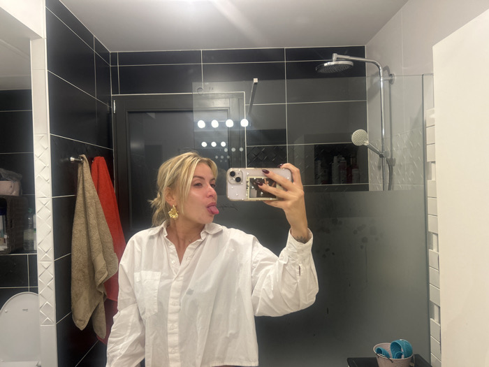 In a bathroom with black and white tile, a woman in a white button-down shirt sticks out her tongue while taking a selfie in the mirror