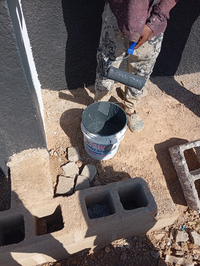 This image captures an outdoor scene centered on an individual engaged in painting. A person, visible from the mid-torso downwards, stands on dry, light brown, sandy ground, wearing paint-splattered dark clothing and footwear. The individual's right hand grips a paint roller with a blue handle, its roller head saturated with dark grey paint. Directly below the roller, a white plastic bucket, approximately half-filled with the same dark grey paint, rests on the ground. To the left, a textured wall section is visible, freshly painted dark grey with a distinct vertical stripe of white paint along its edge. In the foreground, two hollow concrete blocks lie horizontally; one contains grey aggregate, and the other, partially visible to the right, exhibits white paint residue. Broken concrete fragments are scattered on the ground near the wall. Strong, clear shadows are cast by the person, the bucket, and the blocks, indicating direct sunlight. The scene is located in the city of DU, Nigeria.