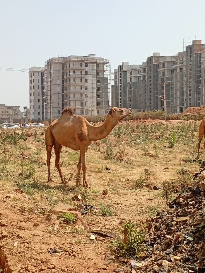 - "An outdoor scene in a peri-urban area of Abuja, Nigeria, depicts a lean, light-brown dromedary camel standing centrally on dry, reddish-brown earth sparsely covered with green scrub" by FM-gztIu1, licensed under CC BY 4.0