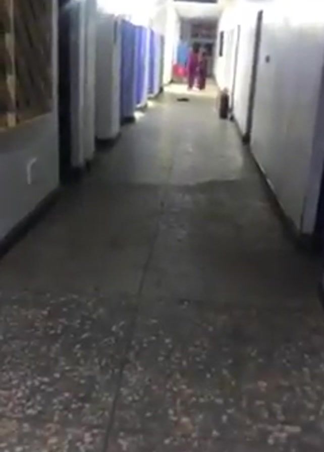 long, dimly lit hallway with white walls and a gray, speckled floor. On the left side of the hallway, there are several cubicles with blue curtains. On the right side, there are closed doors. Further down the hallway, two people in dark clothing are walking away from the camera. At the end of the hallway, there is some red furniture and a sign overhead. A fire extinguisher is also visible on the right side of the hallway. The camera moves slightly, providing a view from the end of the hallway.