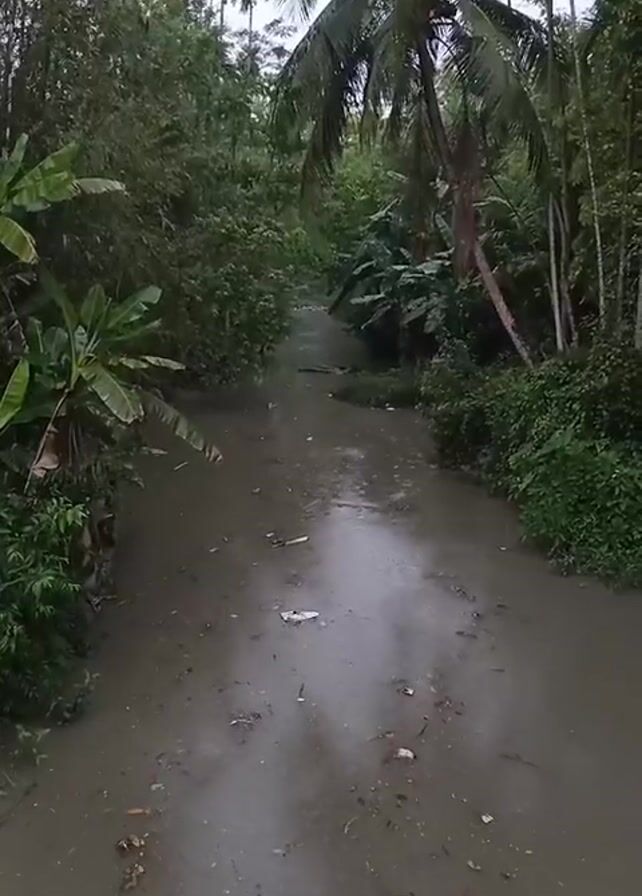 muddy, debris-filled waterway running through a dense, green, tropical environment