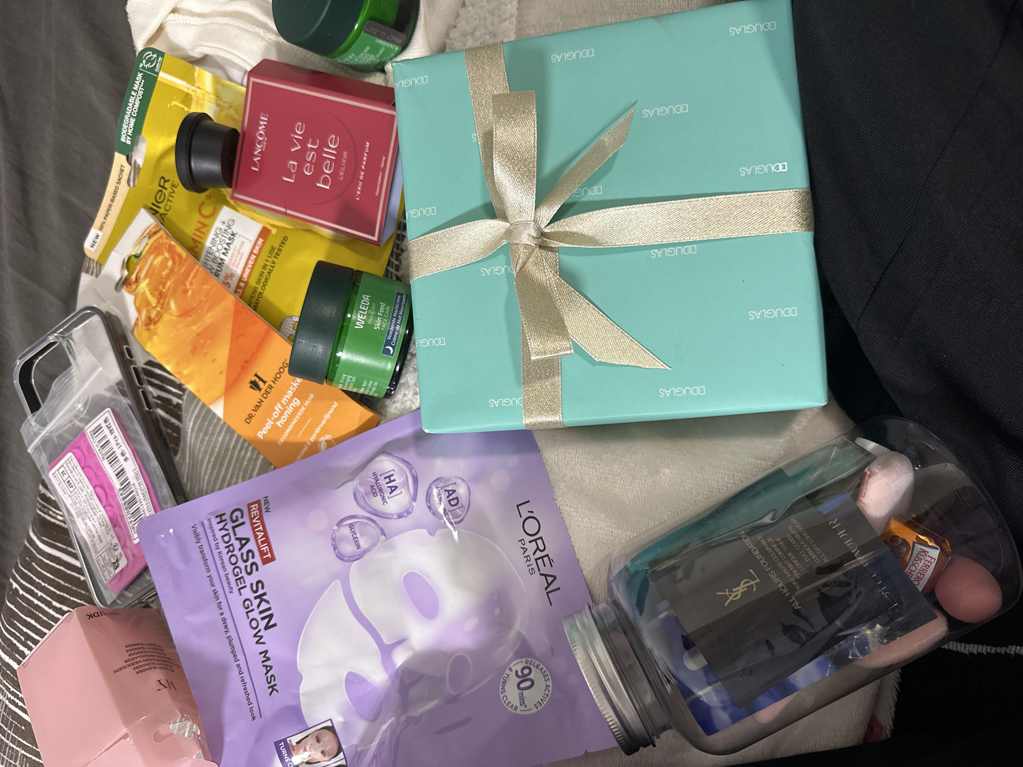 n assortment of beauty and skincare products scattered on a surface with mixed textures. Predominant items include a Douglas gift box wrapped in light blue paper and a gold ribbon, L'Oréal Paris Revitalift Glass Skin Hydrogel Glow Mask, Lancome La Vie Est Belle L'Elixir perfume, Garnier sheet masks, and Weleda Skin Food face cream. There's also a clear jar containing beauty blenders and chocolate candies. Additional items include packaging for makeup blenders. No location is apparent in the image, there are no indicators of it being in Alicante, Spain. There are no people, actions, or interactions visible in the image.