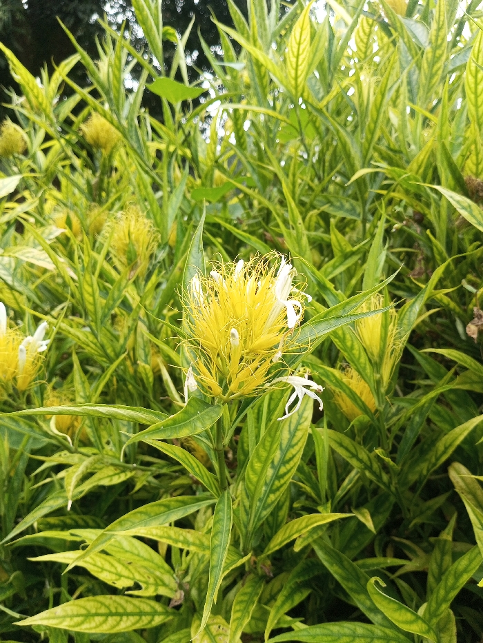 A vibrant image showcases a flowering plant with variegated leaves, featuring green and yellow hues. The plant boasts distinctive yellow, spiky flowers with delicate, white petal-like structures extending outward. The dense foliage and multiple flower heads create a lush, textured scene, suggesting a healthy and thriving plant. The background is softly blurred, emphasizing the plant as the central focus.