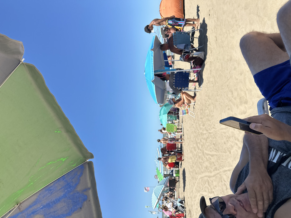 A beach scene under a clear blue sky. A row of beach umbrellas and people in chairs stretches into the distance. A person is seated in the foreground, visible from the knees up, wearing blue swim trunks. The individual is holding a cell phone. Another person's face and sunglasses are visible at the bottom left of the frame. A large green and blue beach umbrella is also visible in the foreground.