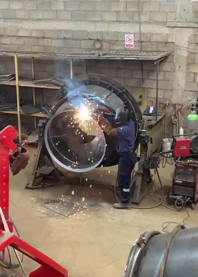 In a workshop, a person in a blue uniform and welding mask is welding a large metal structure that is mounted on a rotating frame. The person is standing and holding a welding tool that emits bright sparks and smoke as they work. The sparks fly outward and downward, scattering on the floor. The metal structure is cylindrical with an opening in the middle, and it is held in place by a black metal frame. In the background, there is a brick wall, a shelf with metal sheets, a red welding machine, and a green gas cylinder. A red machine and another large metal cylinder are visible in the foreground.