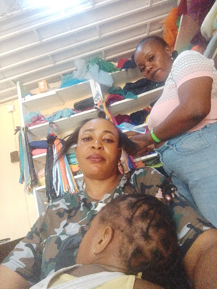 The image depicts an indoor scene in Sabon Tasha, Nigeria, involving three individuals: two adult females and one child. In the foreground, an adult female with light brown skin, wearing a camouflage-patterned long-sleeve top, faces the camera. Her hair is partially styled, with some sections braided and other strands loose around her face. A small child with dark, short hair and a visible left ear bearing a small gold hoop earring is resting on her lap/chest, facing away from the camera. The child is wearing a light yellow garment. Behind and to the right of the first woman, a second adult female with dark skin, wearing a light pink and white patterned short-sleeve top and light blue denim jeans, looks towards the camera. Her left arm, adorned with a bright green bracelet, is positioned near the head of the first woman, suggesting an action related to hair styling. The background features white, multi-tiered shelving units against a light tan wall. The shelves are stocked with various items, including rolls of fabric or textiles in multiple colors (e.g., blue, green, red, black, purple, pink), bundles of hair extensions or decorative ribbons, and several hair combs. A pair of scissors hangs from the side of one shelf. The ceiling area consists of white horizontal slats, and a bright light source is visible overhead.