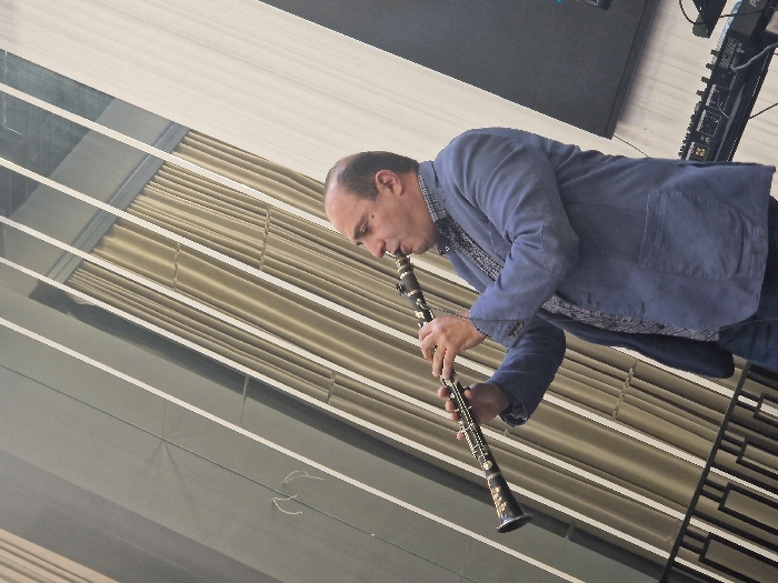 A male musician, estimated to be in his 40s to 50s with a balding head and short dark hair, is actively playing a dark woodwind instrument, likely a clarinet, which features gold-colored decorative bands near its flared bell