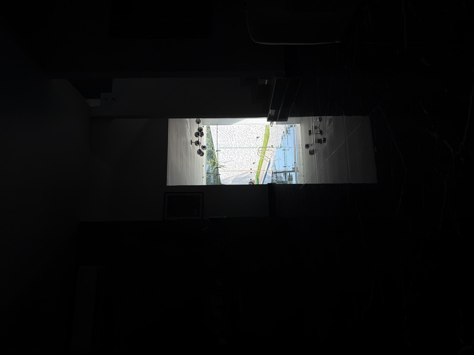 The image depicts a dimly lit interior space in Villahermosa, Mexico, looking through a rectangular opening towards a brightly illuminated exterior. The interior floor is composed of highly reflective dark, possibly black, tiles that show reflections of the outdoor light. Above the opening, a modern chandelier with multiple dark, spherical light fixtures is visible. To the left of the opening, a dark-framed picture or mirror hangs on a lighter wall section. To the right, a staircase with visible steps ascends from the floor level. The exterior scene features a light blue swimming pool equipped with a two-rung ladder for access. Behind the pool, a textured white or light-colored wall with vertical patterns forms a barrier, beyond which green foliage, likely trees or bushes, is discernible under bright daylight conditions. There are no individuals, overt actions, or interactions present within the frame.