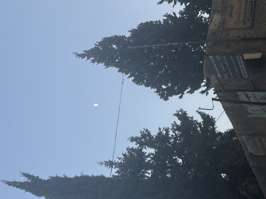 The image displays an outdoor, daytime scene under a clear, light blue sky in Al-Mazza Municipality, Syria. A distinct waxing crescent moon is visible in the upper center-left portion of the sky. The mid-ground and lower sections are characterized by dense, dark green coniferous trees, with a tall, slender tree on the far left and another large tree occupying the right side, partially obscuring a utility pole. A black horizontal wire, likely electrical or communication, traverses the mid-sky between the trees. The foreground consists of a textured, light-colored stone or concrete wall. Affixed to this wall are several signs featuring Arabic script; one prominent blue sign explicitly identifies "Al-Mazza Educational Center" and provides Syrian telephone numbers (0996251991, 011/6600229), confirming the specified location. Another sign includes a red medical cross. A black metal L-shaped bracket is also mounted on the wall to the left. No individuals or direct human actions are depicted.