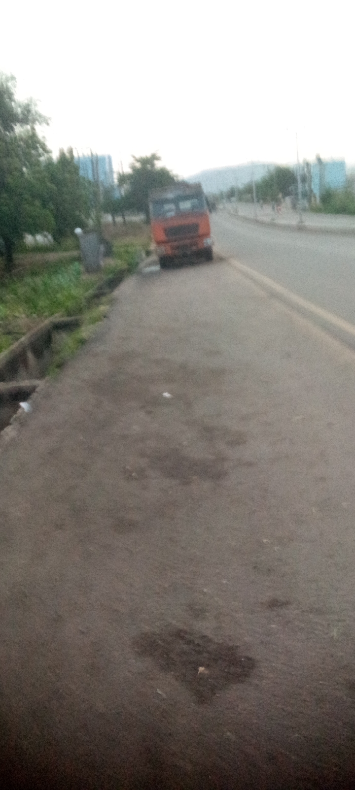 This image displays a section of a roadway in Lokoja, Nigeria, under an overcast sky. The foreground features a dark gray paved surface with irregular dark stains and scattered light-colored refuse. A concrete drainage channel runs along the left edge of the pavement, bordering an unkempt strip of green grass and trees. A stationary orange-red heavy-duty truck is positioned on the left side of the road, partially obscured by vegetation, facing away from the viewer. A light-colored cylindrical object stands to the left of the truck, behind the drainage channel. The road itself is marked with faded double yellow lines on its right side, extending into the midground where other indistinct structures are faintly visible. A low-lying hill range is discernible on the distant horizon. No people are present, and no actions or interactions are depicted.