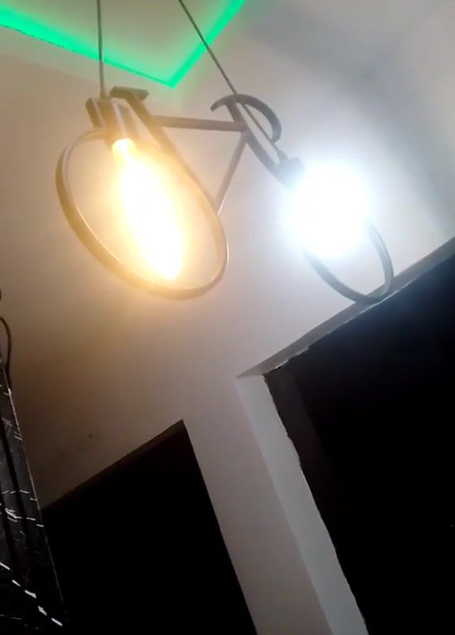 n indoor space with a bicycle-shaped pendant light fixture hanging from the ceiling. The light fixture has two round bulbs, one bright yellow and the other intensely white. The ceiling is white with a green LED strip outlining its perimeter. The video pans to show a black doorway and part of a white wall. An air conditioning unit is visible on the upper right side of the frame. The recording appears to be taken from a low angle.