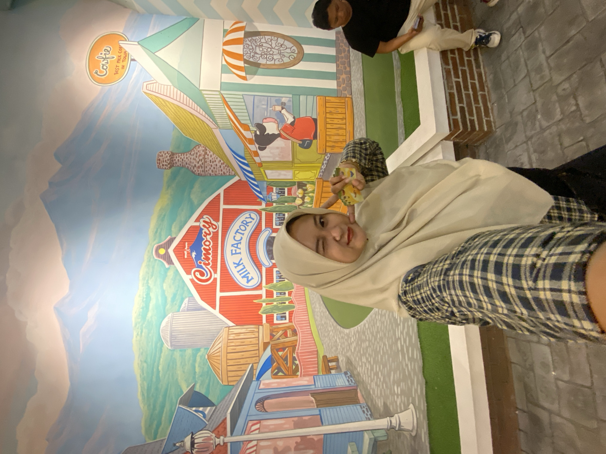 A photo of a person in a headscarf and plaid shirt posing in front of a mural at the Cimory Dairy Land and Restaurant in Prigen, Indonesia. The mural depicts a cartoon landscape with buildings labeled "Cimory Milk Factory" and "Cookie Best Milk Co in Town". Another person is visible in the background, sitting on a brick structure. The ground appears to be painted or textured to look like cobblestones.