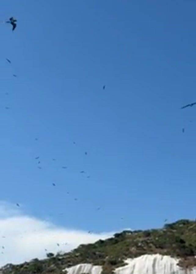- "The video captures a multitude of birds soaring in a clear blue sky, with a rocky, green hill visible in the lower portion of the frame" by FM-z2WOI2, licensed under CC BY 4.0