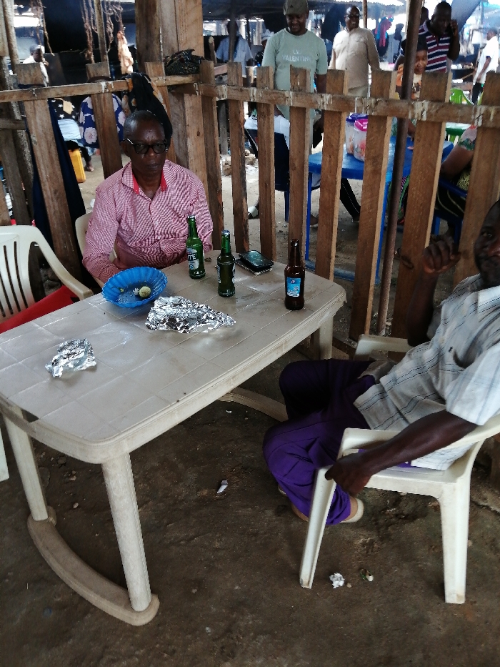 The image depicts an outdoor or semi-enclosed public gathering area in Machinjioni, Tanzania, characterized by informal construction. A rectangular, light-colored plastic table occupies the mid-foreground, resting on an uneven concrete or compacted dirt floor with scattered debris. On the table are three glass bottles: two dark green and one dark brown, consistent with beverage containers. A blue plastic bowl contains light-colored remnants, possibly food scraps, and two crumpled pieces of aluminum foil are also present. A dark-colored smartphone lies on the table between two bottles. An adult male with dark skin, wearing glasses and a red-and-white patterned long-sleeved shirt, is seated in a white plastic chair on the left side of the table. To the right of the table, another adult male with dark skin is seated in a white plastic chair, wearing a light-colored, horizontally striped short-sleeved shirt and purple trousers. He is angled slightly away from the camera. In the background, a barrier constructed from vertical wooden planks separates the immediate seating area from a more populated section. Through and beyond this barrier, several other individuals are visible, indicating a bustling environment. One adult male in a light green "VALENTINO" t-shirt and a cap stands behind the wooden barrier. Other indistinct figures are present, some standing and one appearing to use a mobile phone.