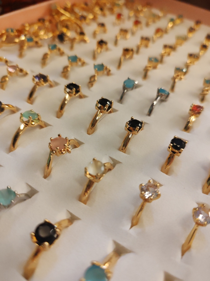 A tray filled with gold rings, each featuring a single stone. Stones vary in color, including black, white, turquoise, red, and pink. A few rings have silver bands instead of gold. The rings are neatly arranged in rows and columns within the tray, suggesting a display of jewelry for sale.