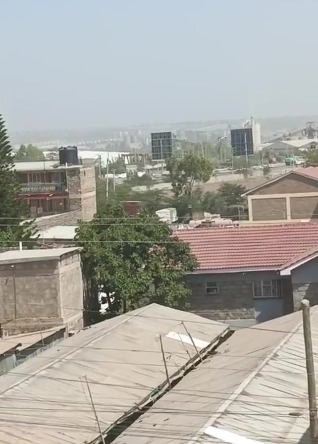 n elevated view of a densely built-up urban or suburban area, likely in a developing country. Buildings are a mix of single-story structures with corrugated metal roofs and multi-story buildings constructed of concrete blocks. The structures appear somewhat weathered. Overhead power lines are visible. In the distance, larger buildings and billboards hint at a more commercial area. Some vehicles can be seen moving on roads between the buildings. The sky is bright but hazy. A person is standing on a balcony in a green dress. A man is sitting on a motorcycle in front of the building. Overall, the scene depicts a busy, populated area with a mix of residential and commercial activity.
