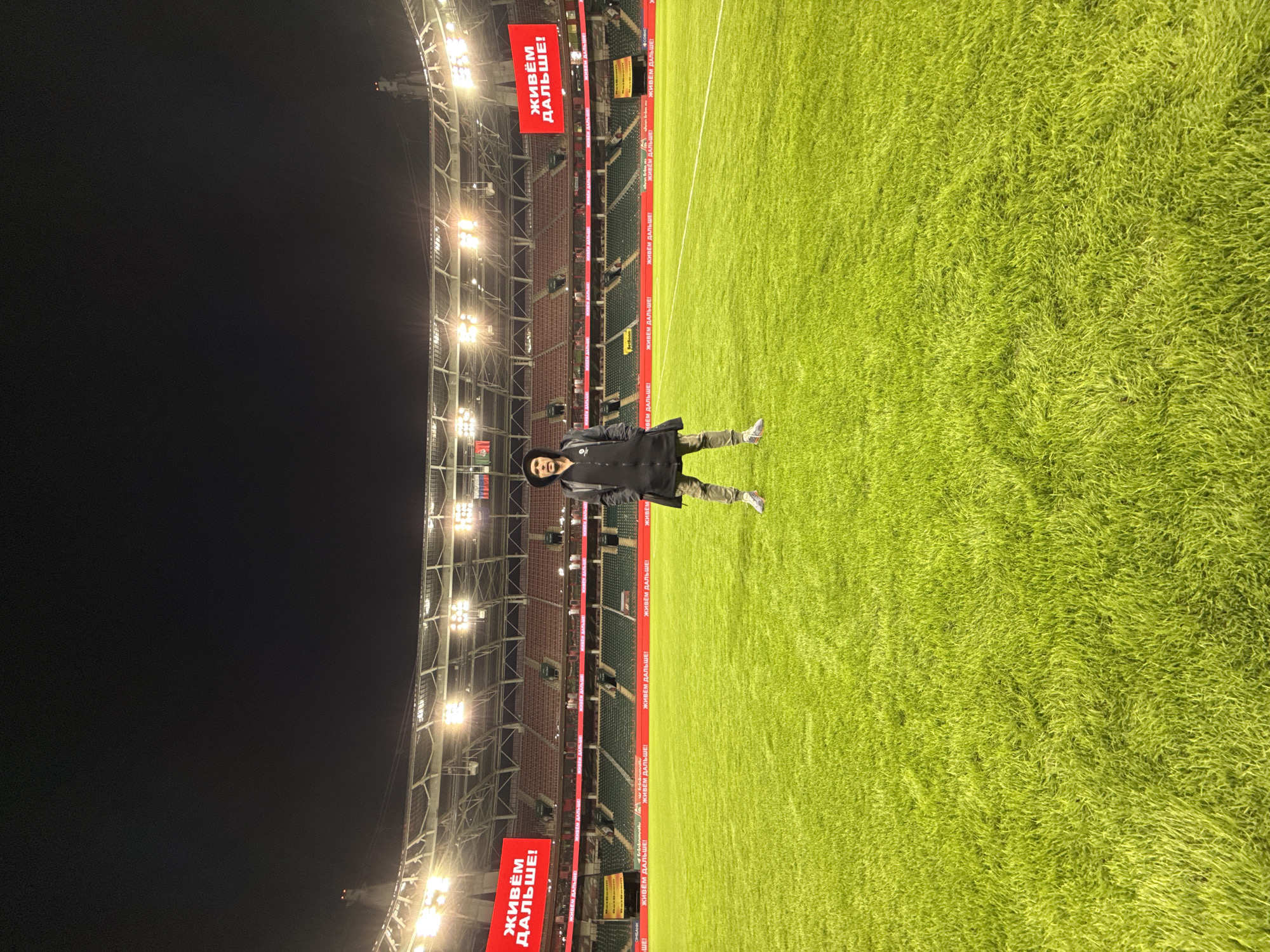 person standing on a green lawn in a stadium at night. The stadium has bright lights illuminating the seating area and signage in Russian that reads "ЖИВЁМ ДАЛЬШЕ!". This translates to "We Live On!". The location appears to be in Moscow, Russia, likely at the Otkritie Bank Arena, also known as Spartak Stadium. The person is wearing dark clothing and casual footwear. The field is neatly maintained and extends to the right side of the frame. The stadium seating is visible in the background. The overall atmosphere is dimly lit, with the stadium lights being the primary source of illumination.