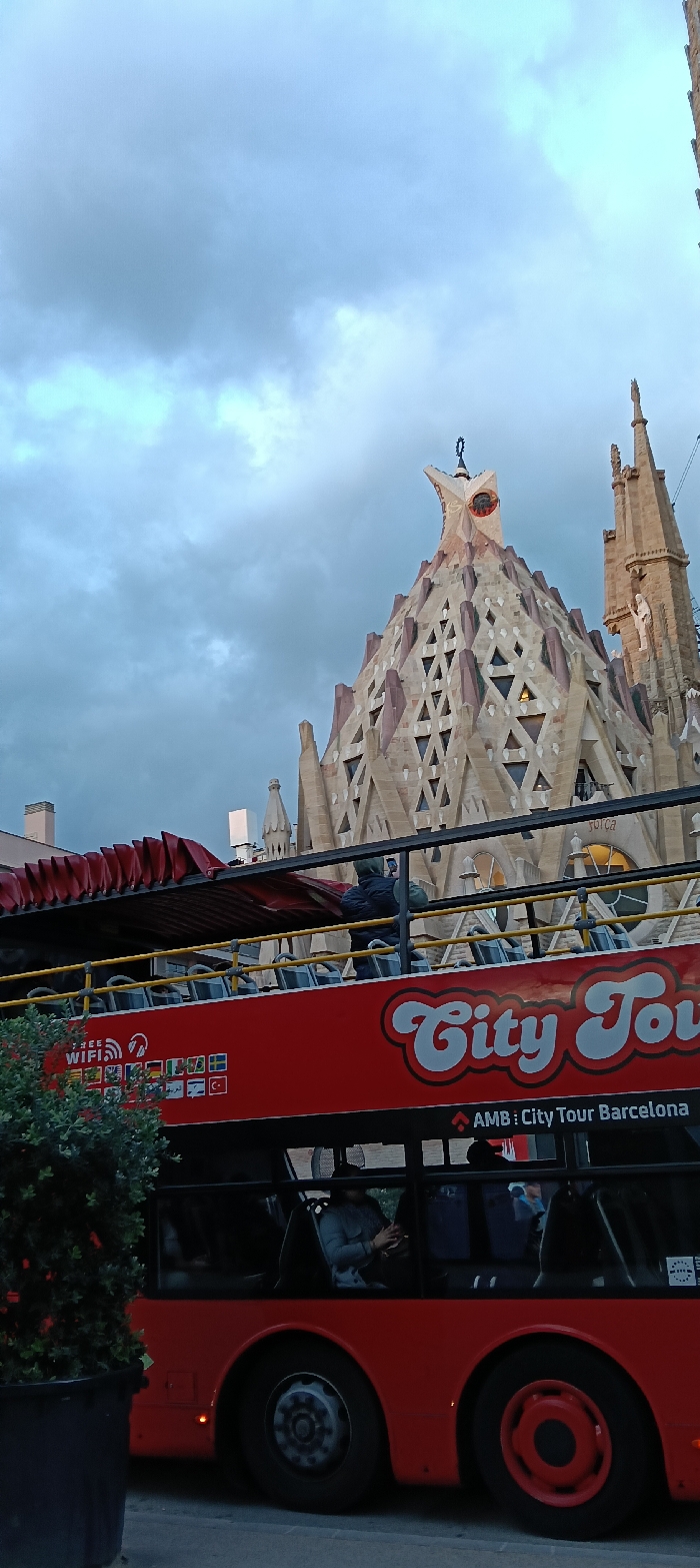 The Sagrada Familia in Barcelona stands tall behind a red City Tour bus. The basilica's distinctive spires and intricate facade are partially visible against a cloudy sky. On the open-top level of the bus, a person is taking a picture, while others sit inside. The "City Tour" logo is prominent on the bus. A potted plant partially obscures the lower left corner.