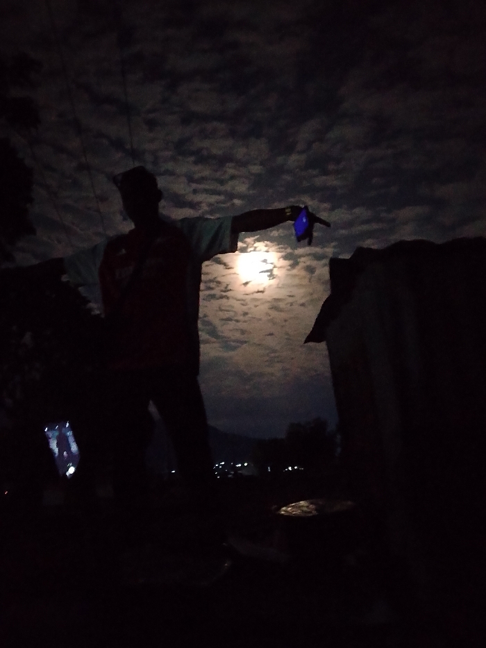A nocturnal scene is captured in Unknown, Unknown. A single individual stands in the center-left foreground, silhouetted against a prominent, nearly full moon. The person wears a light-colored top over a darker garment and dark trousers, with their arms extended horizontally. Their right hand holds a mobile phone that emits a distinct blue light, positioned directly in front of the brightly illuminated moon. The moon is partially obscured by extensive, altocumulus-like cloud formations that fill the sky. To the lower left, another mobile phone screen is visible and illuminated, possibly displaying or recording content. In the distant background, below a visible horizon line, scattered urban lights indicate a settlement, with dark, indistinct landforms, possibly hills or mountains, rising behind them. The immediate foreground contains dark, undifferentiated masses on both the left and right, with an irregular, angular dark structure present on the right.