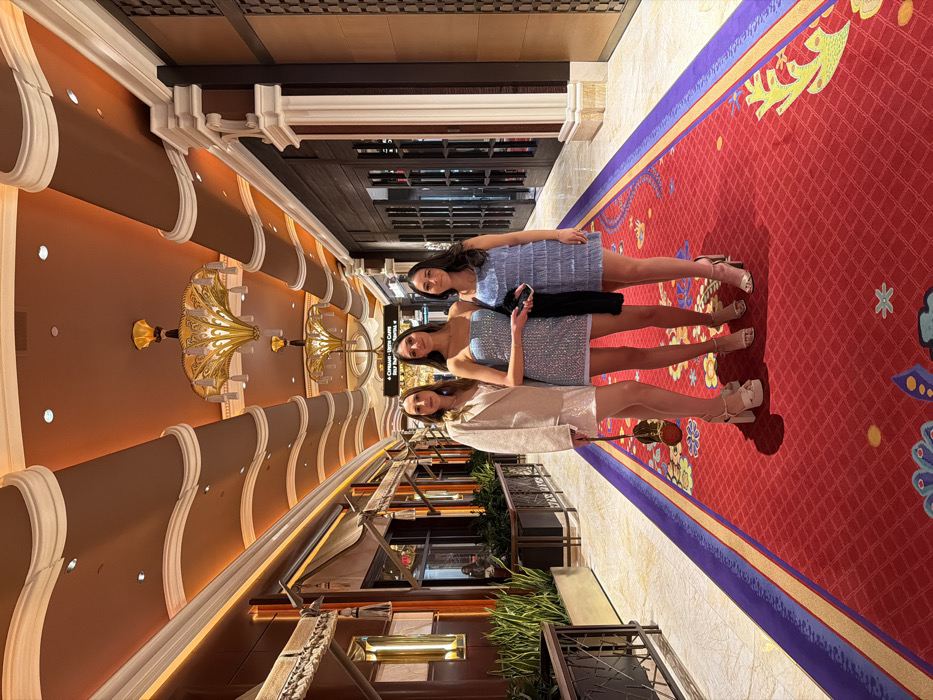 Three young women stand in a line on a red patterned carpet inside a luxurious building
