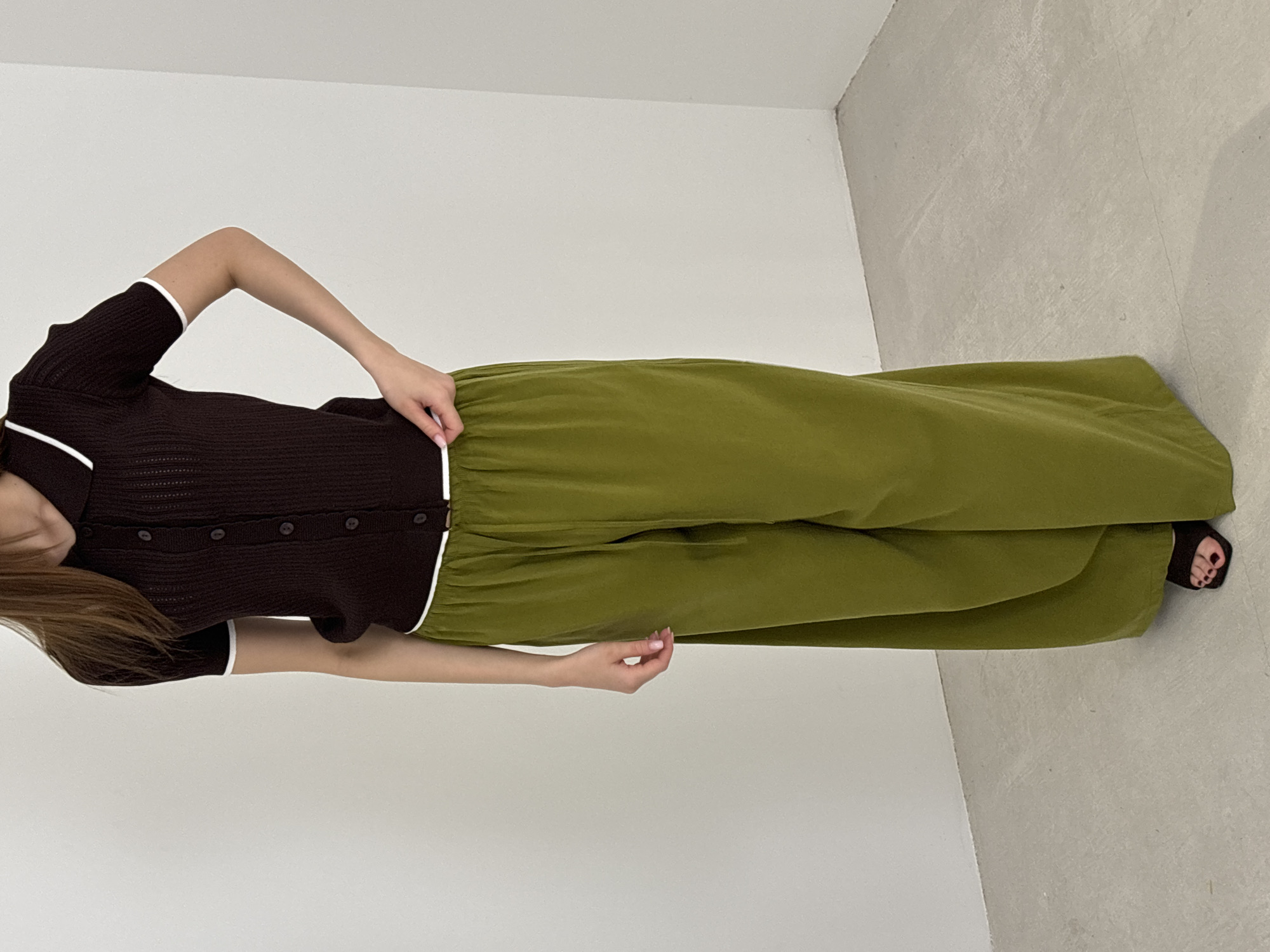 This scene is situated in Krasnodar, Russia. A lone individual, identified as a woman, is depicted standing full-length against a plain white wall and light grey floor. She faces directly towards the viewer with her head slightly turned left, revealing long, straight, light brown hair. The woman wears a short-sleeved, dark brown knitted polo shirt featuring a white collar and white trim on the sleeve cuffs. The shirt has a central button placket with six dark brown buttons, all fastened. Her lower garment consists of loose-fitting, wide-legged olive green pants, appearing to be made of a soft, possibly velvet or velour, fabric with a drawstring waist. Her left hand is positioned on the front waistband of her pants, gently pulling the fabric. Her right arm hangs relaxed at her side. She wears dark brown or black open-toed flat sandals, exposing feet with toenails painted dark red or burgundy. The background shows a minimalist indoor setting with a white wall forming an internal corner on the right side, and a light grey floor exhibiting minor surface variations consistent with concrete or a large tile.