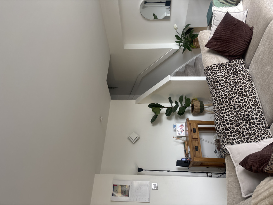 This image depicts an interior residential space in Bristol, United Kingdom. The scene presents a brightly lit living area, featuring neutral-toned walls and a carpeted staircase ascending from the right side of the frame. A smoke detector is visible on the white ceiling. In the foreground, a light-colored sectional sofa is partially visible, adorned with a leopard print throw blanket and several cushions, including a dark brown corduroy cushion and a plain light-colored cushion. Against the left wall, a wooden console table with two drawers is positioned. On its surface, a black electronic device, a charging smartphone, a wooden tray containing a reed diffuser, and a small framed picture are arranged. Beneath the table, a pair of light-colored sandals are visible on the floor. A tall, black floor lamp with a conical shade stands beside the table. Above the table, a wall-mounted calendar for March with an illustration and a double electrical socket are present. Centrally on the wall, a decorative arrangement of three nested white square panels is mounted. A large Fiddle Leaf Fig plant, housed in a green and natural woven pot on a wooden stand, stands to the right of the console table. To the far right, an arched mirror hangs on the wall, reflecting portions of the room and a dark object, likely the top of the floor lamp. Below the mirror, a smaller potted plant, possibly a Peace Lily, rests on the floor. A grey-carpeted staircase with white handrails ascends from the right of the frame, leading to an upper level. No individuals are present in the scene.