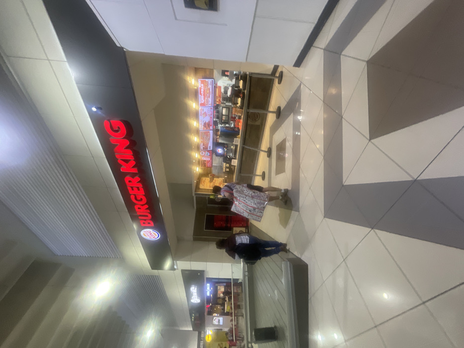 The image displays an interior view of a brightly lit commercial food court, consistent with the architecture found in the Querétaro International Airport (AIQ) in Querétaro, Mexico. The floor features a pattern of polished light-colored and dark grey tiles. Dominating the central and right portions of the frame is a Burger King restaurant, identifiable by its illuminated red "BURGER KING" sign on a dark facade. Inside the establishment, digital menu boards display various food items, and a service counter with metal stanchions defining a queuing area is visible. To the left of the Burger King, another fast-food restaurant is partially visible. In the left foreground, a dark grey, sloped structure resembling a baggage carousel or a large counter is present. Three individuals are observed in the mid-ground. On the far left, an individual wearing dark attire and a dark backpack is walking away from the Burger King, seen from behind. To the right of this individual, a second person, also seen from behind, wears a light-colored top and dark shorts, carrying a large, rectangular object wrapped in festive paper featuring a red, white, and possibly green pattern. A third individual, partially obscured by the second, accompanies them, visible by their lower legs and footwear. All individuals appear to be in transit within the food court area.