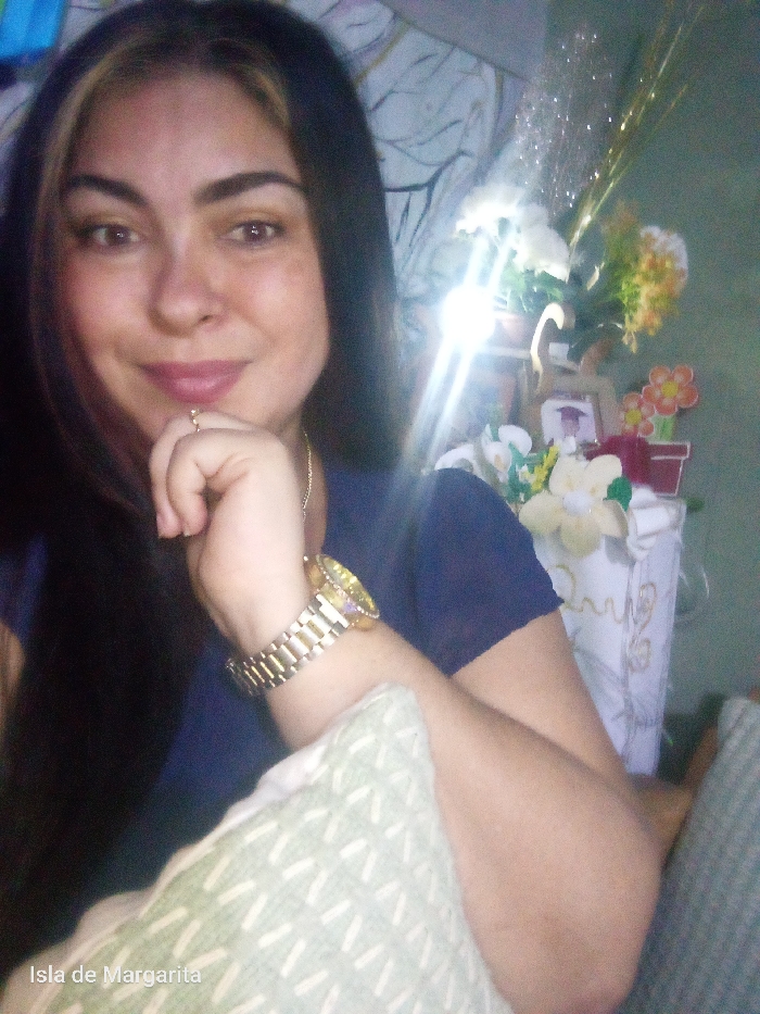 A woman with dark brown hair and a light brown highlight is smiling. She's wearing a navy shirt and a gold watch, resting her chin on her hand with a ring on her finger. A pillow with a green and white pattern is visible in the foreground. In the background is a shelf with decorations, including white flowers, a diploma or photo frame, and a vase with yellow flowers and sparkly decorations.