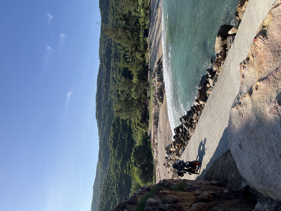 A motorcycle travels on a concrete path along a rocky coastline in Unknown, Vietnam. The path, bordered by dark boulders serving as a retaining wall, runs alongside turquoise-blue ocean water with breaking waves. To the immediate left, a steep, rocky cliff face rises. Further along the coastline, a sandy beach is visible, backed by dense green vegetation and pine-like trees. Several individuals are present on the beach; one figure in light-colored attire stands near the water's edge, and others are scattered under the trees. A dark, possibly temporary, structure stands under the trees on the beach's right side. In the background, lush, verdant hills rise, adorned with utility poles running along their slopes. The sky is clear and blue with minimal cloud cover, indicating bright daylight. The motorcycle is dark-colored with orange accents, and its rider, wearing a helmet and dark clothing, carries a backpack.