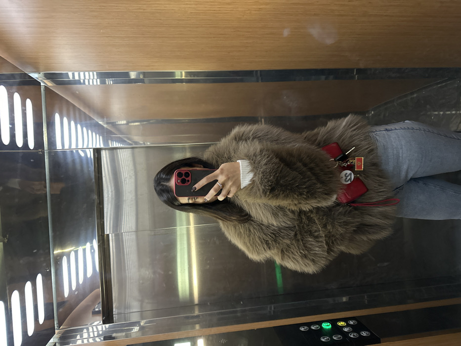 A person is depicted taking a mirror selfie inside an elevator. The individual, visible from the mid-thighs upwards, wears a shaggy light brown fur coat over a white long-sleeved top and light blue denim jeans. A red smartphone, likely an iPhone with a prominent camera module, is held in the left hand, obscuring the person's face. A silver ring is present on the ring finger of the left hand, and fingernails are painted dark. A small red wristlet bag with multiple keychains hangs near the person's right hip. One keychain is a rectangular emblem displaying the flag of Montenegro, and another is a circular white tag with black lettering, appearing to show "SS." The elevator interior features reflective stainless steel panels on the left and rear, with a vertical wood-paneled wall on the right. A black control panel with circular buttons, one illuminated green, is visible on the left wall. The reflective ceiling shows multiple elongated, horizontal light fixtures. This scene takes place within an elevator in the city of Ulcinj - Ulqin, Montenegro.