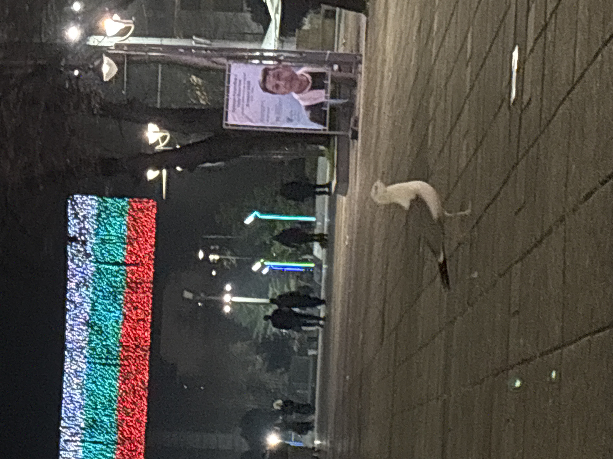 The image depicts a street scene at night. A vertical display of lights in the colors of the Bulgarian flag (white, green, red) is on the left. In the center, there is a poster featuring a man's face. Several people are walking in the background. On the right, a light-colored animal, possibly an ermine or similar creature, is seen on the ground. The location is likely Burgas, Bulgaria.