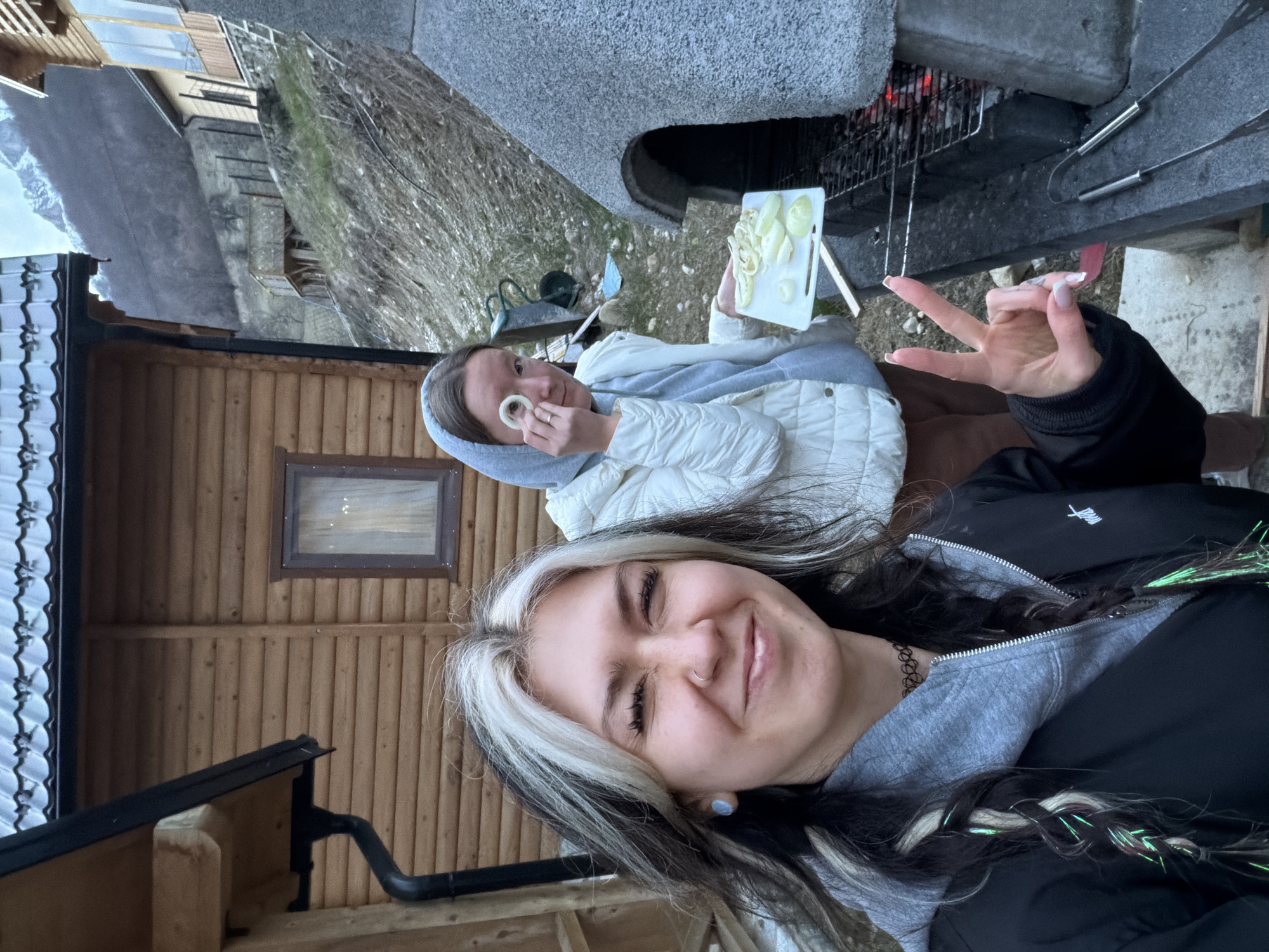 Two women are posing for a selfie outside, near a grill with hot coals. The woman closest to the camera is smiling and giving a peace sign, and has a gray and black zipper jacket over a gray sweatshirt. The other woman is wearing a white puffy jacket and hoodie, and holding up a slice of onion to her eye. There is a board with more sliced onions in the background. The setting appears to be near a wooden building, possibly a cabin, and there is a landscape visible in the distance with trees and a cloudy sky. The location is Gusinje, Montenegro.