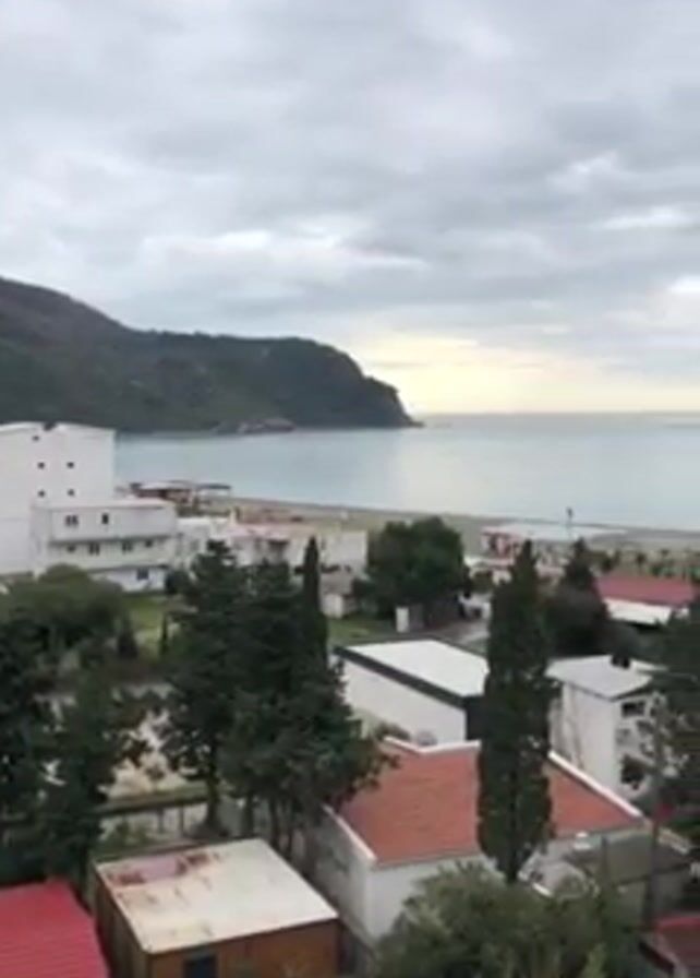 From an elevated perspective, a panorama unfolds, capturing a coastline under a blanket of overcast skies. The horizon is dominated by the meeting of a tranquil sea and the cloudy sky, the water exhibiting a subdued, grayish hue. Along the shoreline, a stretch of beach is visible, dotted with indistinct figures suggesting sparse human presence. The foreground is composed of a dense array of buildings, primarily residential, interspersed with lush green vegetation, predominantly trees. The architectural styles vary, with some buildings displaying white facades and others having roofs of red or terracotta color. Tall, slender trees punctuate the landscape, contributing to the overall verdant appearance of the scene. The scene appears serene and quiet, possibly depicting a small coastal town or resort area on an overcast day.