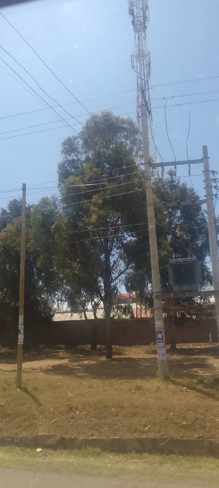 The image depicts an outdoor scene in Viwandani ward, Kenya, under a clear blue sky. In the foreground, a paved road surface is partially visible at the bottom, bordered by a concrete curb separating it from a dry, unkempt patch of ground covered with sparse, brown grass and exposed soil. Rising from this ground are three prominent utility poles. The leftmost pole is slender and wooden, exhibiting posters affixed to its lower section. The two poles to the right are thicker, appearing to be concrete. The second pole from the left supports multiple horizontal utility lines and has a dark gray electrical transformer mounted high on its side, between it and the rightmost pole. Numerous utility cables crisscross horizontally across the upper frame, connecting to these poles and extending beyond the frame. In the midground, a dense line of trees with varying heights and green foliage forms a visual barrier, partially obscuring background elements. Behind these trees, a tall, lattice-structured telecommunications tower dominates the right side of the upper frame, equipped with multiple antennas and transceivers. Further in the background, visible through gaps in the trees, are sections of a brown wall, corrugated iron roofs, and a multi-story building with a reddish roof structure. No people, vehicles, or specific actions are visible in the frame. The lighting suggests a bright, sunny day.